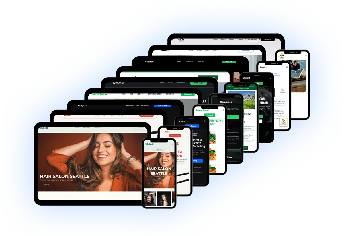 Choose from 9 client-ready websites: Solar, Landscaping, Cleaning, Beauty Salon, Marketing Agency, Restaurant, Salad Bar, & Sales Funnel.